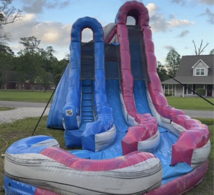 This dramatic, eye-catching 22-foot dual-lane inflatable slide delivers twice the fun in a single rental. Designed for side-by-side racing, it lets two riders climb, launch, and race down parallel lanes for competitive thrills at parties, school events, fundraisers, and corporate functions. The tall, double-track layout creates an exciting visual centerpiece and accommodates more guests by moving two riders at once, reducing wait times. Built with safe, high sidewalls and a cushioned landing zone, it balances adrenaline with practicality—perfect for groups who want a bold, memorable attraction that keeps the energy high.